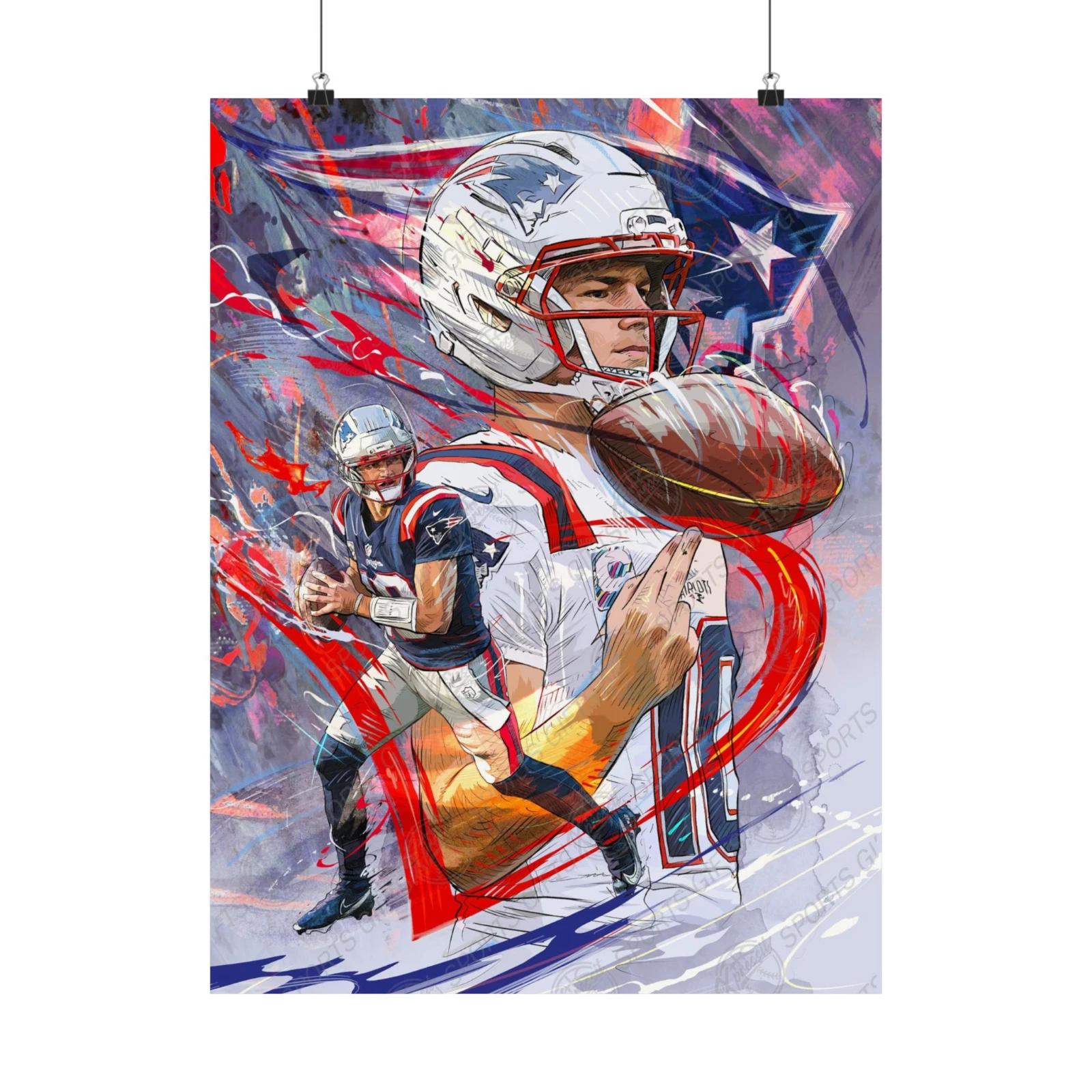 Show your support for the New England Patriots with this AUTHENTIC, one-of-a-kind, POSTER featuring Quarterback, Drake Maye. Perfect for any football fan, this multi-color poster features the team's colors and logo, making it a great addition to your sports wall art collection. This poster is a must-have for any New England Patriots Fan!